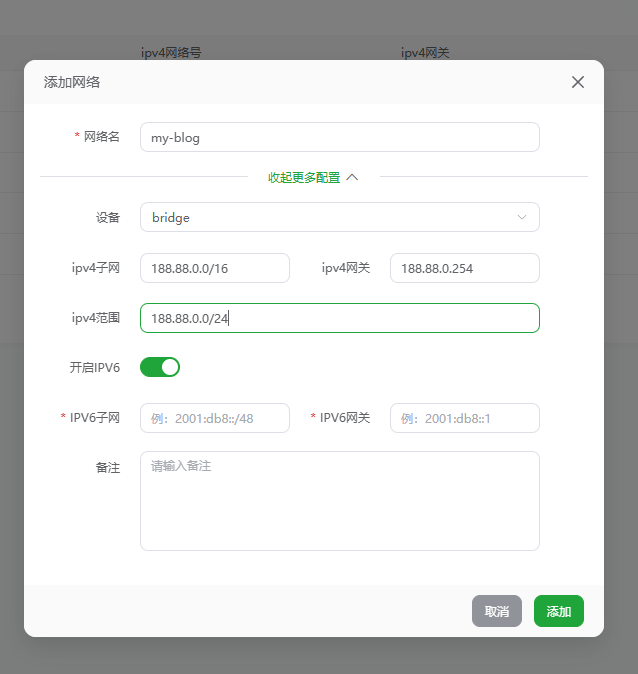 - 配置参数:网络类型选择 “桥接模式”,自定义网段(如 “188.88.0.0/24”,可按个人喜好设置,便于记忆),命名为 “laravel-net”;
