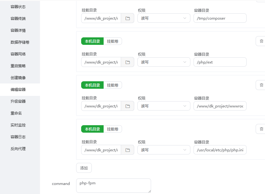 - 挂载卷需删除 /public 后缀:运行目录设为 public,但挂载路径需指向项目根目录,避免路径冲突;