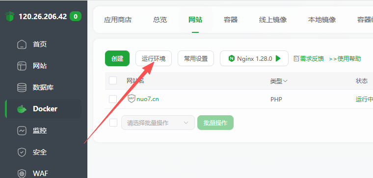 操作路径:「Docker 管理器」-「运行环境」-「创建环境」;
